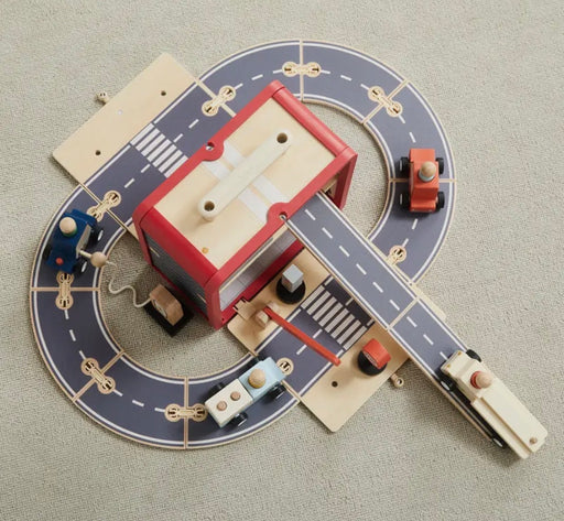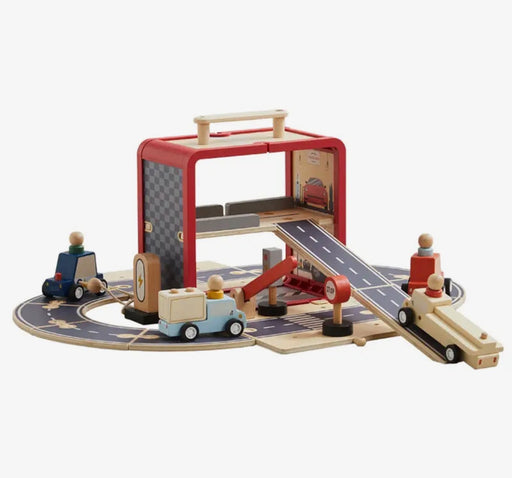 Life-like garage play with 12 wooden pieces including cars, trucks, ramps, signs, peg people & charging station for full-service fun! All-in-o...