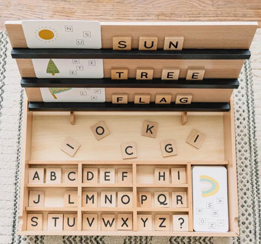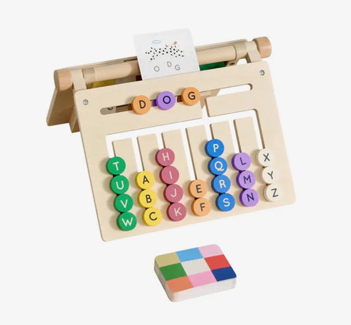 Four-in-one design: sliding-letter spelling maze, shape labyrinth, chalkboard & storage pockets for cards and art supplies. Includes 26 alphab...