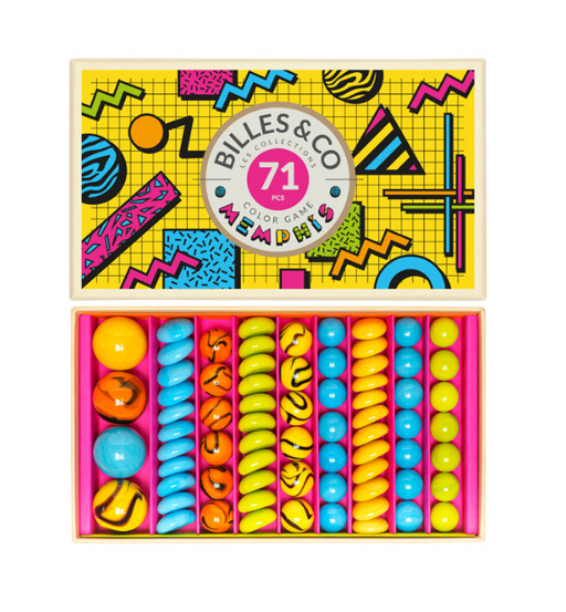 Box of 71 Memphis marbles containing: • 24 marbles (16 mm)• 7 mini marbles (14 mm) • 4 shooters (22/25 mm) • 36 pebble marbles
