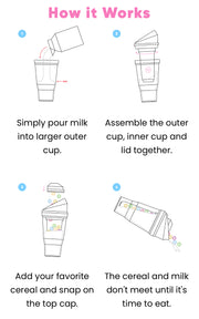 Say goodbye to soggy cereal, The CrunchCup® keeps your cereal crunchy. Simply add cereal to the inner cup, milk into the outer cup, screw on the lid, and you're ready to crunch. The milk and cereal don't meet until it's time to eat.