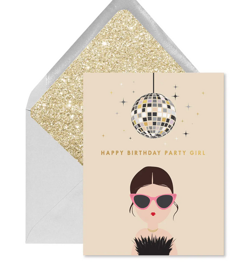 Happy Birthday party girl complete with a gold foil disco ball! With light gray envelope and gold glitter liner. Gold foil accents, full-color, 4.2...
