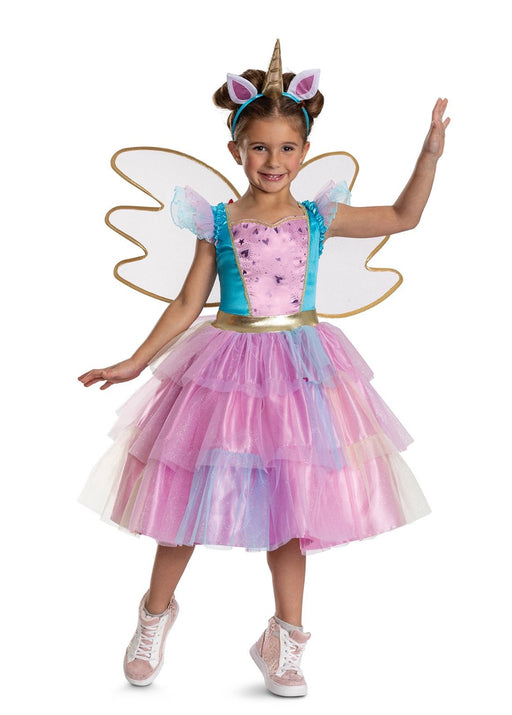 Unicorn child costume with pastel skirt and glittery tulle that sparkles Detachable gold-edged wings and shiny unicorn horn headband