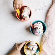 Our Ice cream set rules. Its complete with 4 cups and mini-spoons. Just the right size for two scoops (three if you really squish them in) and super cheerful (as ice cream is) with its assorted pop palette. Awesome option for a zero waste birthday party! Made with bamboo fiber, its reusable and dishwasher safe, making it a real alternative to wasteful disposables, or moms breakable stuff!