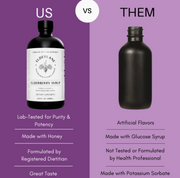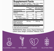 INGREDIENTS: ORGANIC ELDERBERRIES, HONEY, GINGER, CINNAMON, CLOVES, HIBISCUS, LEMON JUICE