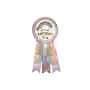 • It's My Birthday rosette brooch by Mimi & Lula. Hip, hip, hooray! Your little one will feel extra special on their big day with this fabulous 'It's my Birthday' rosette. Better yet, it can be used again and again, year after year. Features a shimmering appliqué rainbow and stars atop layers of scalloped trim glitter and metallic leatherette fabric. Finished with layers of satin, grosgrain and glitter ribbons in an array of rainbow colours.