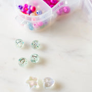 리틀 미스 유니콘 비즈 키트에는 다양한 비즈가 포함되어 있어 나만의 팔찌나 목걸이를 만들 수 있습니다. 글리터 알파벳 비즈, 무지개 빛깔의 하트, 별 비즈 등 다양한 색상과 핑크, 클리어 스트링이 포함된 키트입니다.