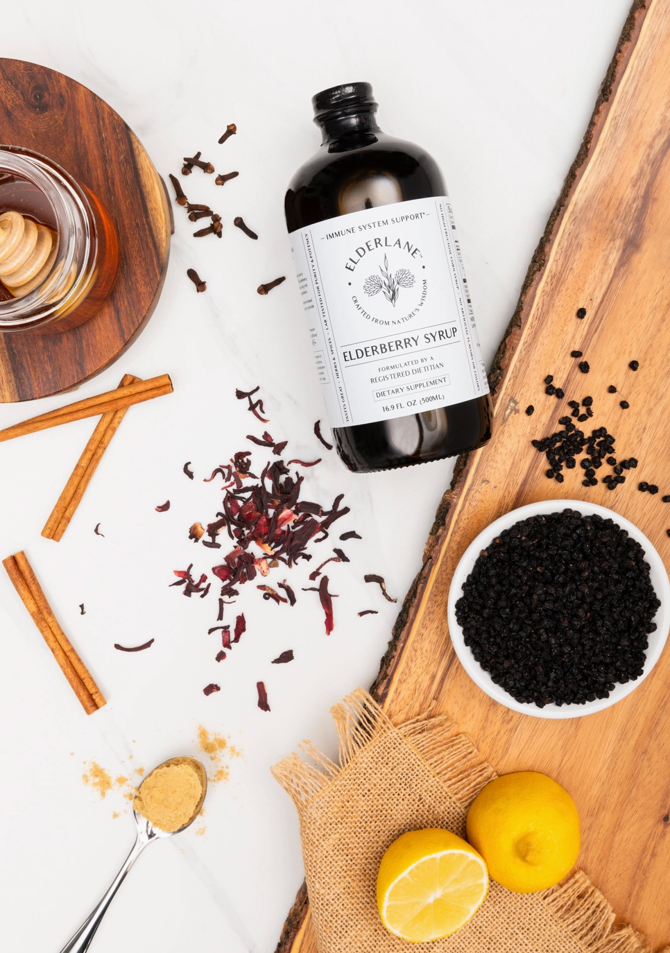 INGREDIENTS: ORGANIC ELDERBERRIES, HONEY, GINGER, CINNAMON, CLOVES, HIBISCUS, LEMON JUICE
