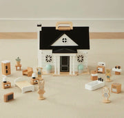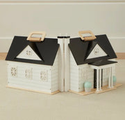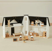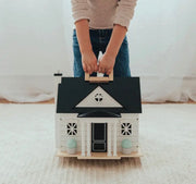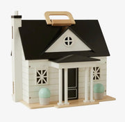 There's no place like home--Home Sweet Home Dollhouse, that is! Our carry along dollhouse opens it's doors to a ton of imaginary play! Comes with bathroom (tub, toilet, sink), bedroom (bed, nightstand, plant) living room (sofa, end tables with drawers that open, tv and 2 lamps) and kitchen (fridge, oven and sink), plus a furry family of 4 that can be removed from their stands. Folds up and has a built-in handle for easy transport. Home Sweet Home is where the heart is!
