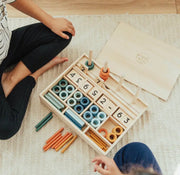 The Math Path has never been so easily paved, and is so much fun, kids won't even know they're learning!  Our set comes loaded with 43 tiles that include numbers and equation signs, 44 color counting sticks, 64 color counting rings, a removable equation tray, and 4 ring stacking pegs.  They all fit inside of our wooden storage box that closes with a sliding cover. From the very young to older children, The Math Path helps teach equations, counting, color matching, and more.  Get on the right path!