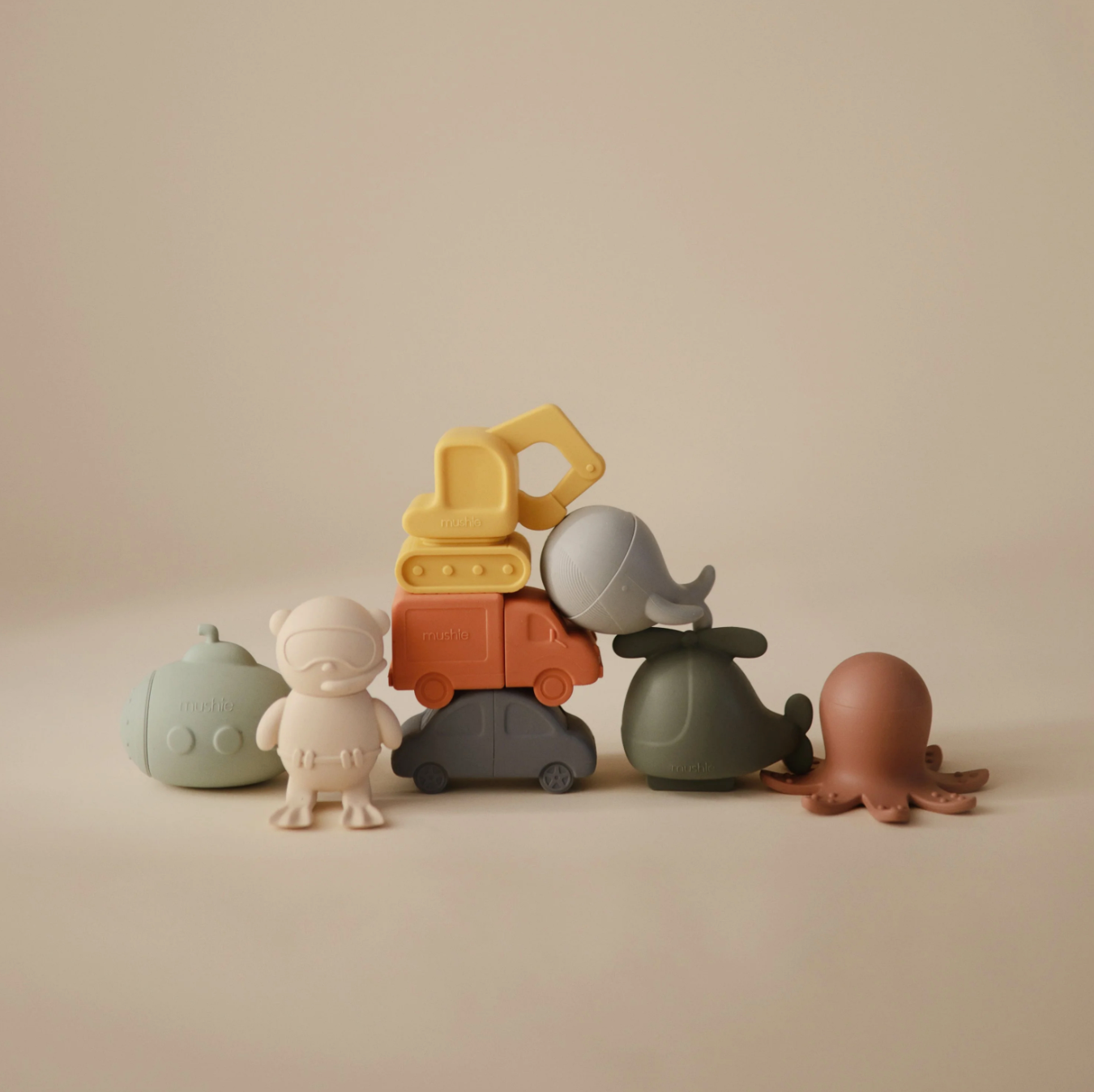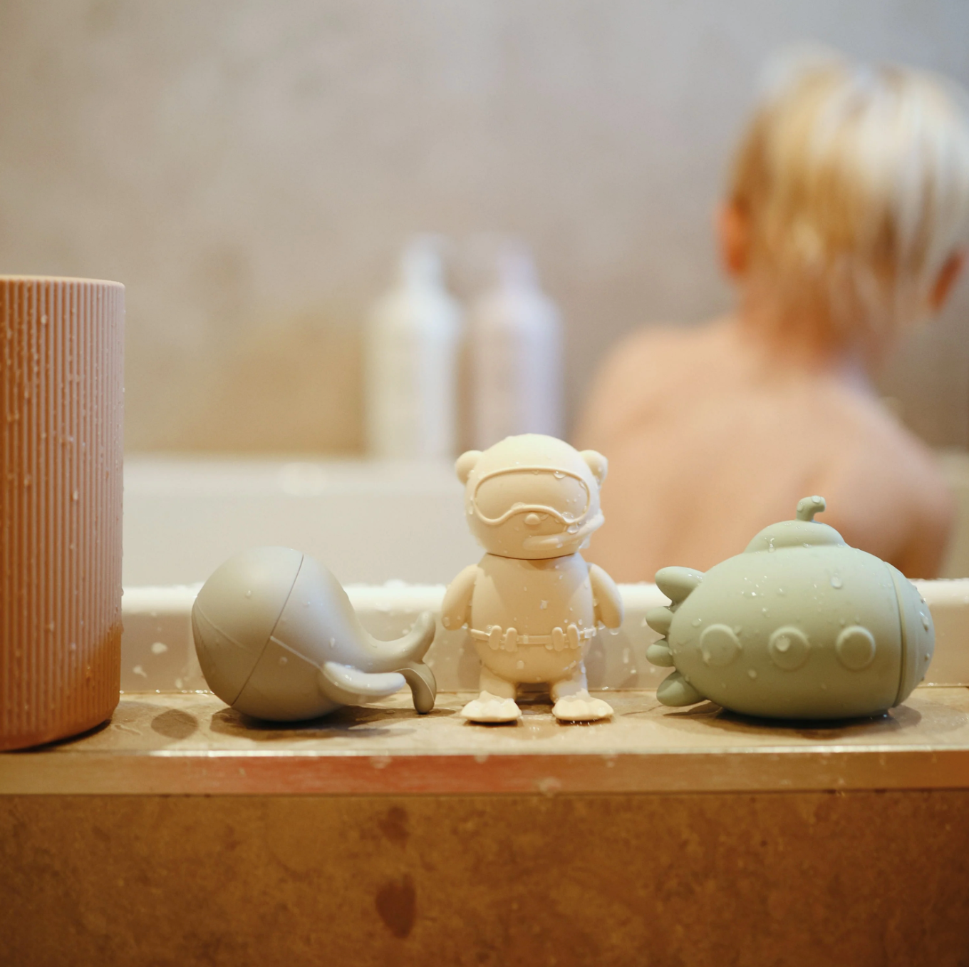 Make a splash at bathtime with the sealife bath play set that includes a submarine, scuba diver, octopus and whale. Made from 100% food grade silicone, the soft material is easy for little hands to hold while wet or dry. Its inventive design allows each toy to open into two separate pieces for thorough cleaning and fast drying. This feature allows the toys to remain mold-free with its easy-to-clean pieces that are dishwasher safe. After each use, we recommend opening the pieces to rinse out and air dry before storing.